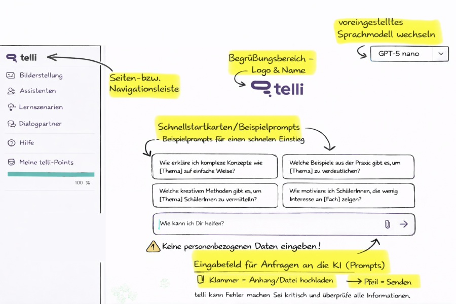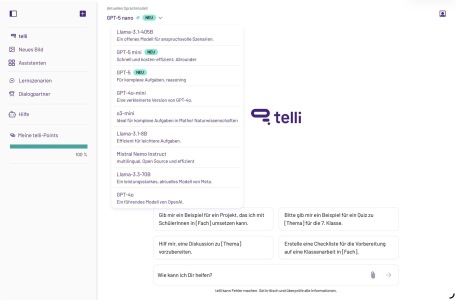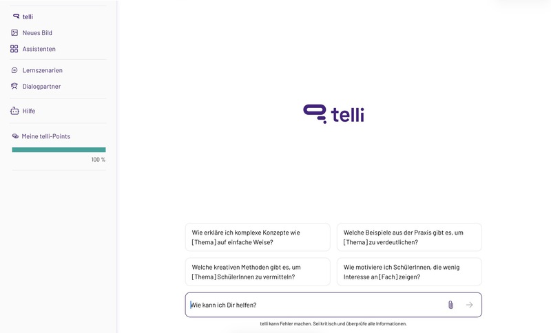 telli.schule ist ein kostenloses und datenschutzkonformes KI-Werkzeug für Schulen. Der vom FWU mit Lehrkräften aus allen Bundesländern entwickelte Chatbot wurde speziell für den Unterricht gestaltet und ermöglicht einen einfachen Einstieg in den Umgang mit Künstlicher Intelligenz.