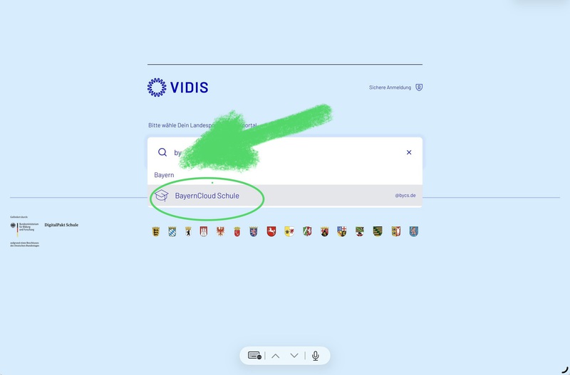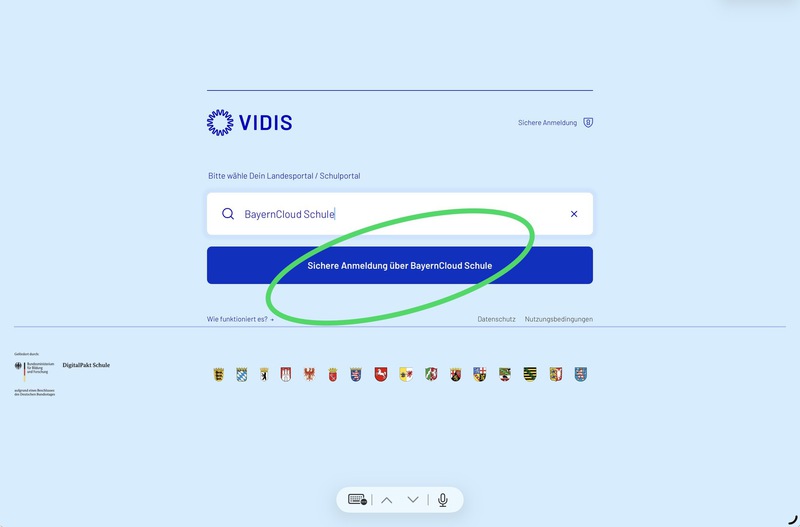 3. Sie gelangen auf die VIDIS-Seite. Dort geben Sie "BYCS" ein, wählen die Option BayernCloud Schule und klicken auf "Sichere Anmeldung über BayernCloud Schule".